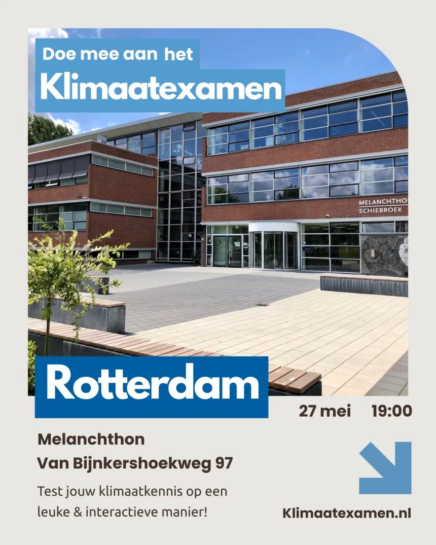 Wil jij zelf alvast een keer ervaren hoe het is om een examen te maken in de gymzaal of wilt u weer nostalgisch een uur zweten in de gymzaal? Meld je/u dan aan voor het klimaatexamen dat wordt afgenomen op Melanchthon Schiebroek op woensdag 27 mei van 19.00 uur tot 20.00 uur. Aanmelden kan via de website www.klimaatexamen.nl, klik op ‘inschrijven’ en zoek naar ‘Rotterdam – Melanchthon’. Het examen is voor jong & oud, dus iedereen is welkom.